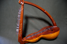 大ひょうたんのハープです。桜木と黒檀と杉板を使用し、螺鈿と蒔絵を入れてみました。思ったより弦のひっぱる力が強くて中心にごつい木を入れました。