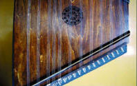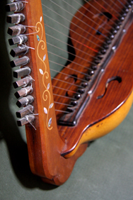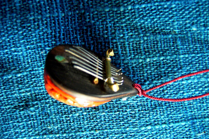 その名のとおり幻想的な音が出る。同じ音階の弦を2弦ずつ並べたので共鳴率が大きい。キズ防止に黒檀をあしらい少し象眼してみた。大瓢箪の塗り漆仕上げ。