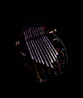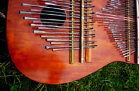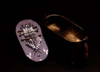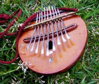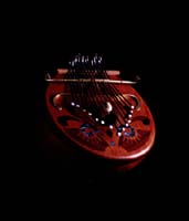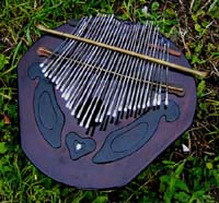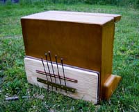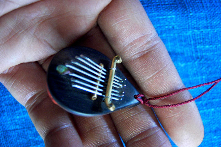 カホンとカリンバを合体させた楽器。低音のベース弦を弾きながらボディーを叩く。内側にはバネが仕込んであるのでクリスピーな音が出る。ブルース音階でニス仕上げ。