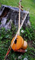 ボディーに瓢箪、ネックに樫、表面は檜の薄い木で制作。共鳴胴が瓢箪と檜の為かエスニックで素朴な音色がする。 |