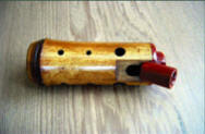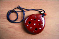 木で作ったオカリナです。朱漆で貝をあしらいました。土よりやわらかい音がでます。