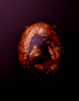 ダチョウの卵で制作した第一号。天坂はアガチスで裏側に油彩で隠者を描き、カシューでコーティングしてある。上に付いてある宝貝は、弦の上で転がすと赤ちゃんのガラガラみたいで楽しい。